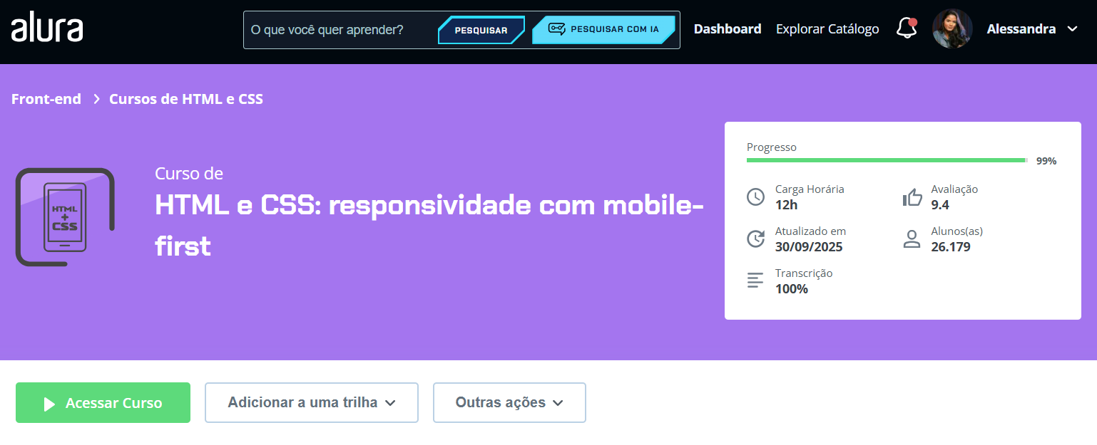 Exemplo: a aula “Criando Header, Flexbox e @import” teve 22 atividades realizadas de 23. Por isso aparece “22/23".
