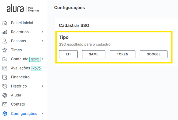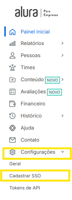 1) No painel corporativo, acesse o menu lateral esquerdo, selecione “Configurações” e, em seguida, “Cadastrar SSO”.
