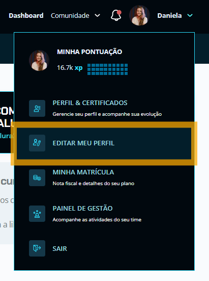 - Para isso, faça login na plataforma da Alura e acesse o seu perfil clicando na seta ao lado do seu nome e selecione “Editar meu perfil”.