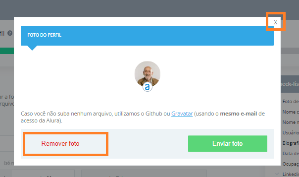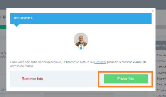 Após selecionar a foto, aguarde um momento enquanto a plataforma faz o upload dela e pronto! Foto atualizada com sucesso! Depois é só clicar no “x” que fica no canto superior direito, para fechar a janela. Caso queira tirar a foto, é só clicar em “Remover foto”.