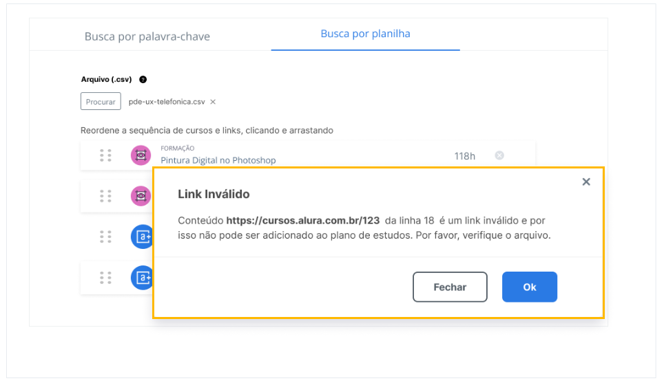 Também é possível incluir esses conteúdos em lote por meio de uma planilha no formato .csv. Esta terá uma única coluna e cada linha terá um link de conteúdo interno da Alura. É possível baixar um modelo do arquivo diretamente na página.