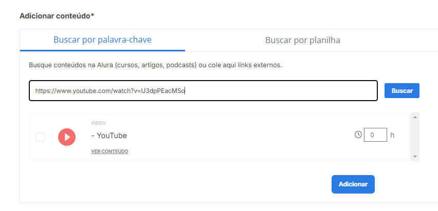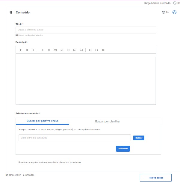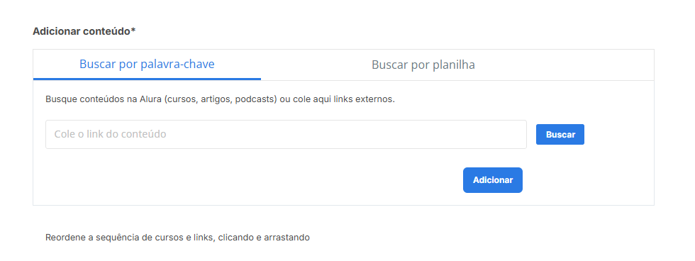 Os conteúdos internos da Alura, como: cursos, formações, artigos, Alura+ e hipsters podem ser incluídos através do campo de busca por meio de palavras-chave ou adicionando o link correspondente.