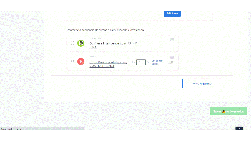 3. Na seção de conteúdo, é possível incluir cursos e conteúdos internos e/ou externos na ordem desejada, além de separá-los em diferentes etapas, de acordo com as necessidades do plano de estudos.