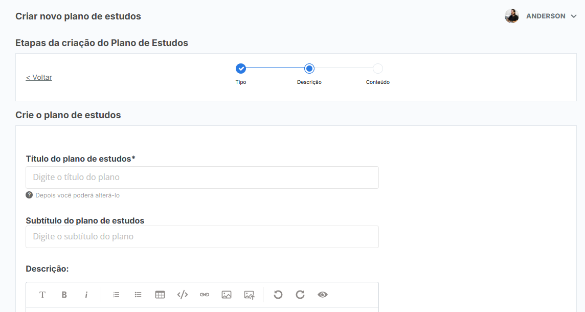 O subtítulo, a descrição do plano de estudos e a cor temática são opcionais.