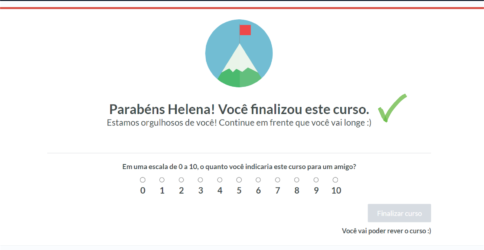 Na página de finalização do curso, clique em “finalizar”. Ao clicar em finalizar, é necessário realizar a avaliação do curso para sabermos o seu feedback.
