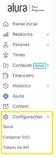 1) No menu lateral esquerdo do painel corporativo, clique em “Configurações” e selecione “Tokens de API”.