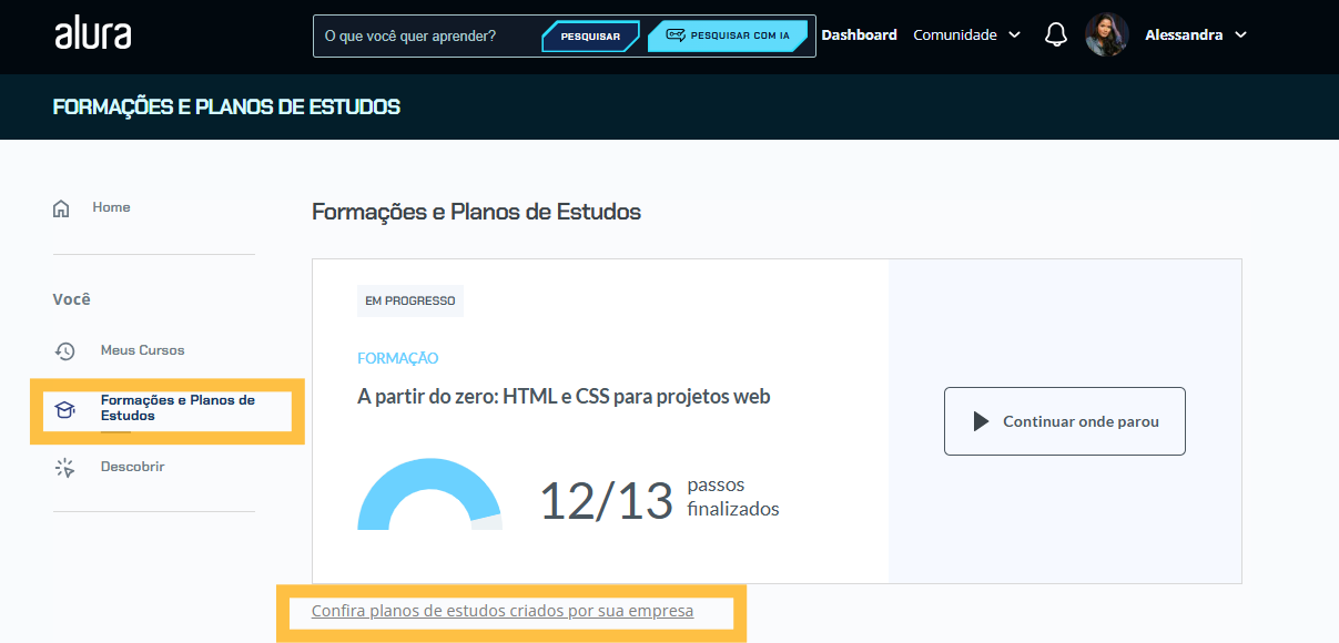 1) Acesse “Formações e Planos de Estudos” e em seguida “Confira planos de estudos criados por sua empresa”: