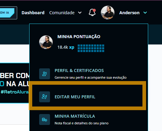 1) Para isso, basta clicar na seta ao lado de seu nome e depois clique em “Editar meu Perfil”