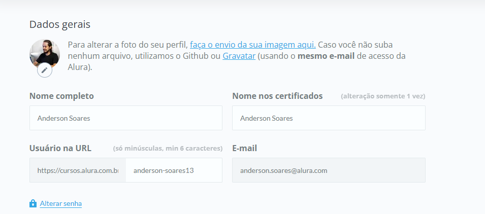 Sim. O próprio usuário pode editar o nome exibido nos certificados pelo seu acesso individual na Alura. A alteração deve ser referente à mesma pessoa que possui cadastro na conta.