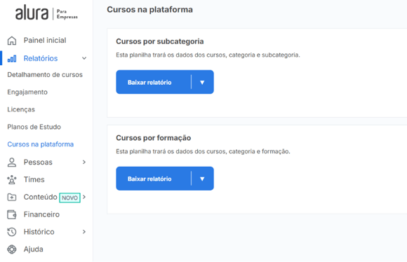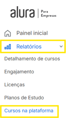 2) Selecione a opção “Cursos na plataforma”. Você verá duas possibilidades de relatório: