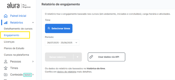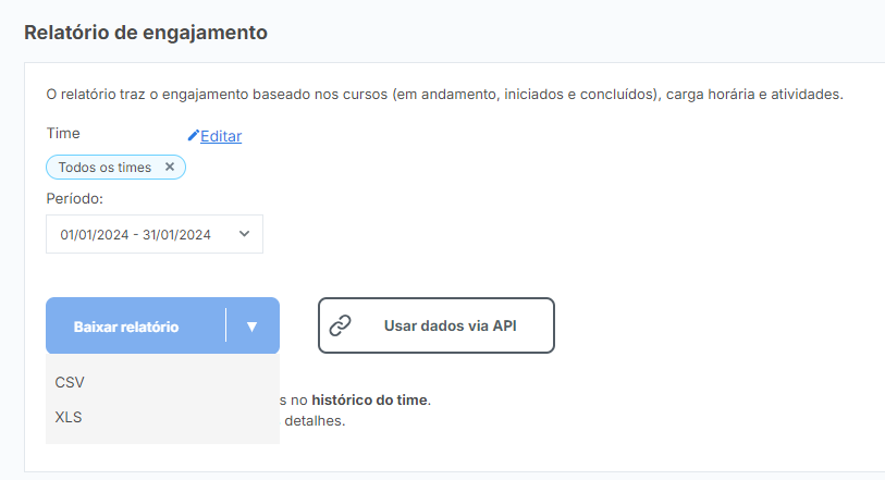 3) Escolha o período e o time que deseja analisar e clique em “Baixar relatório” ou em “Usar dados via API”.