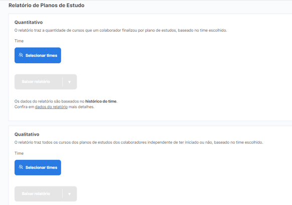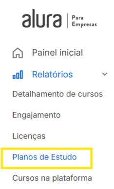 1) No menu lateral esquerdo do seu painel corporativo, clique em “Relatórios” e depois em “Planos de estudos”.